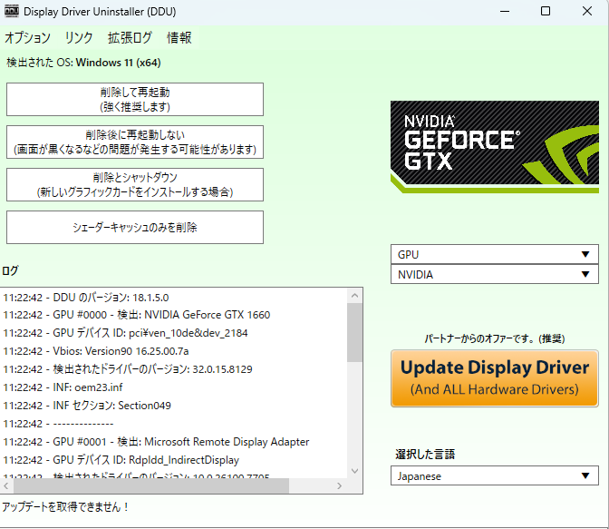 左下のログを見ると、システムに残存している「NVIDIA GeForce GTX 1660」の情報をDDUがしっかり検知できていることがわかります。