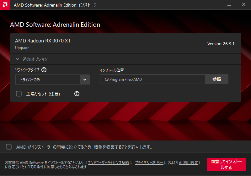 AMDの赤いインストーラーは、「ドライバーのみ(Driver Only)」を選んだとしても、純粋なディスプレイドライバーだけでなく、AMD Crash Defender(クラッシュ時の復旧ツール)や AMD External Events Utility(ホットキーやFreeSyncの制御機能)といったバックグラウンドサービスをOSに強制登録する仕様になっています。