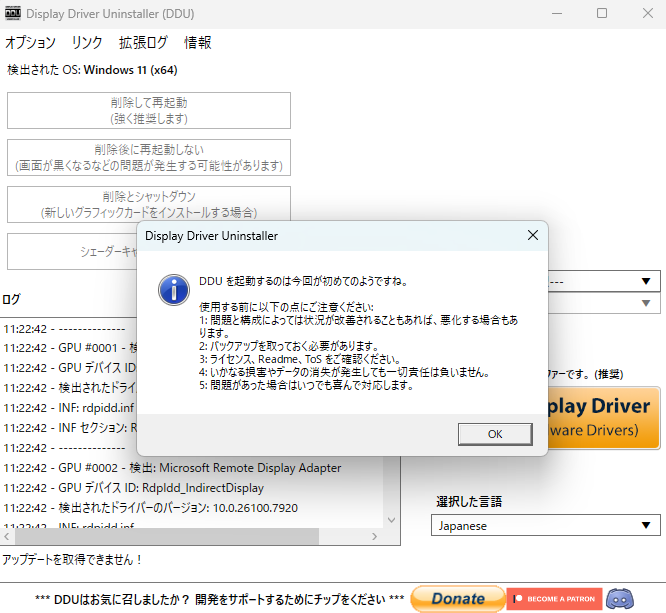 そのため、まずはDDU(Display Driver Uninstaller)を実施し、環境を完全にクリーンアップしました。