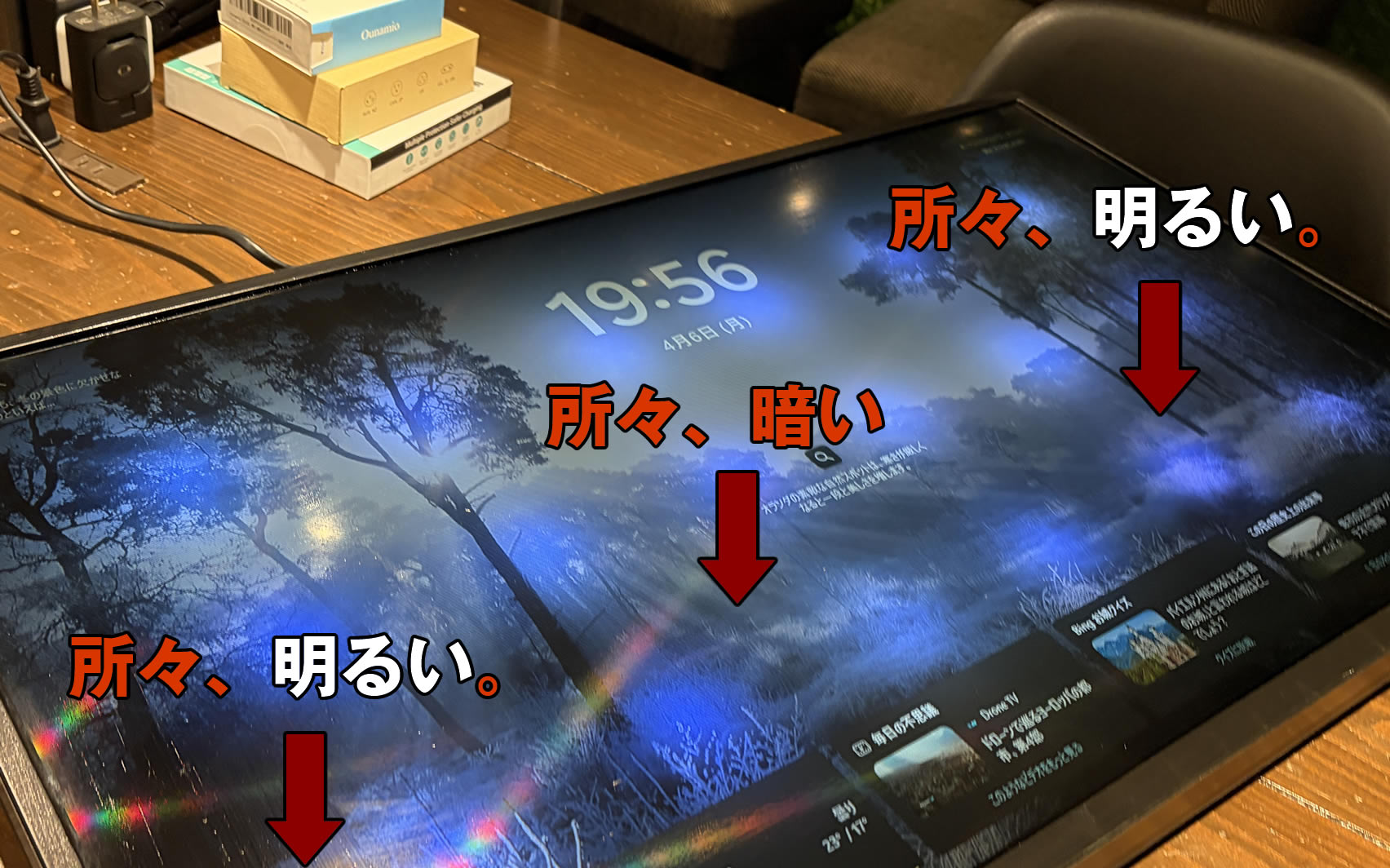 さらに表示を確認すると、バックライトのLEDも場所によって明るさにムラがあり、明るいところと暗いところが出ています。