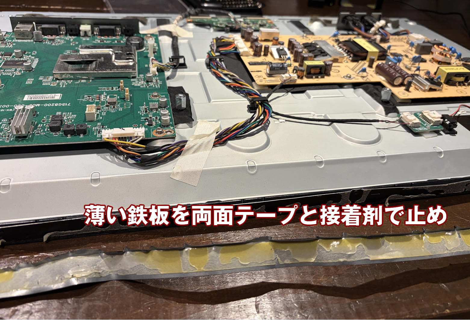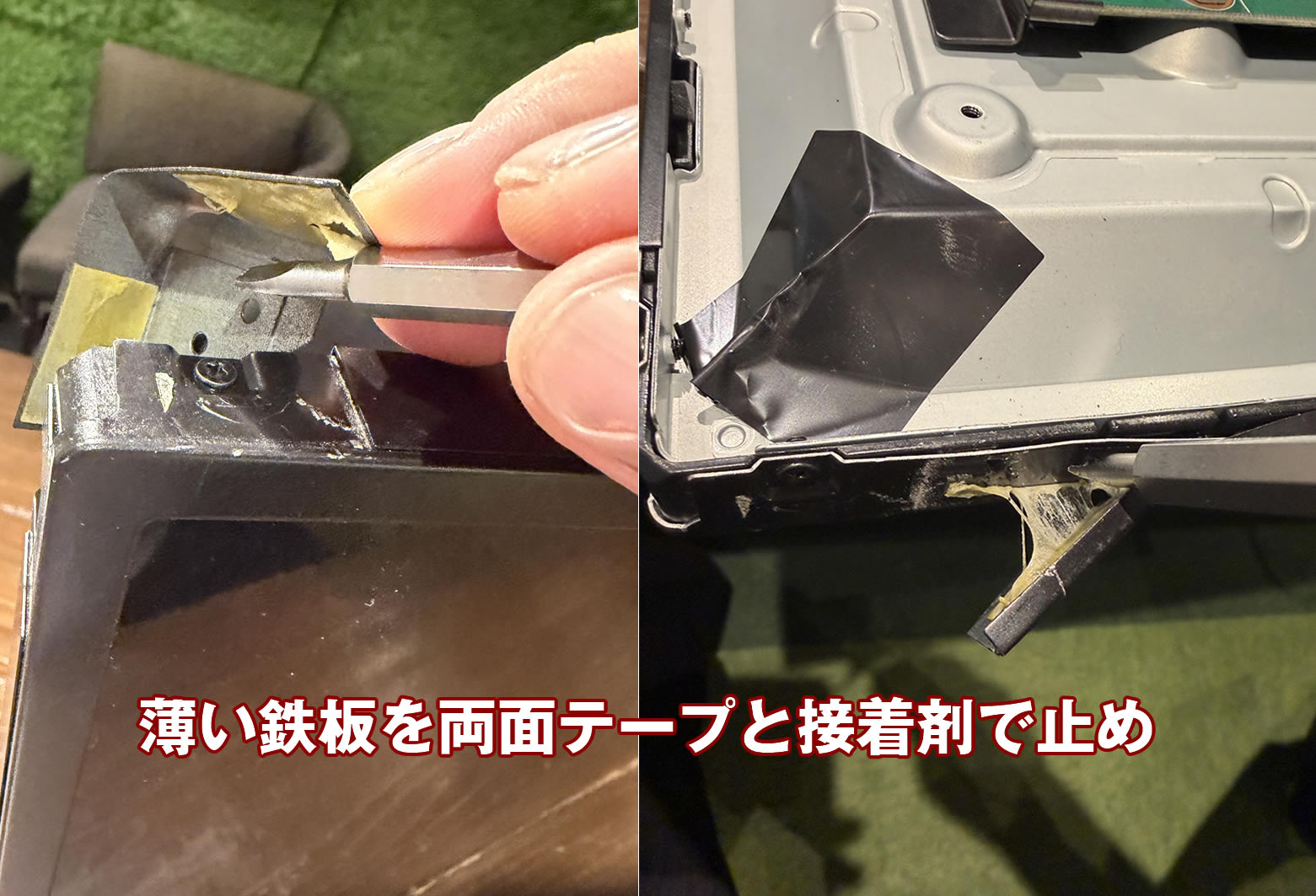 結論から言うと、この液晶は周囲をぐるりと一周、薄い鉄板かアルミ板のような部材で覆い、その上から接着剤と両面テープで固定する構造になっていました。