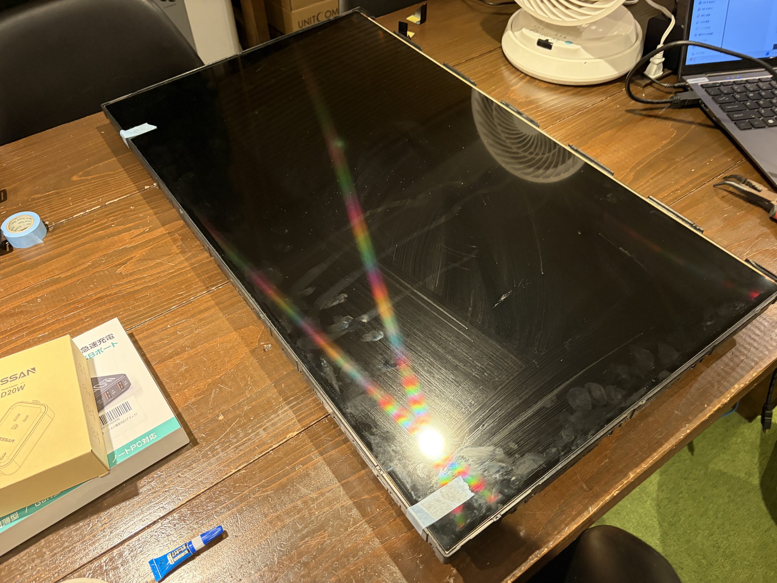 しかも厄介なのは、1個だけではなく、ほかも同じ条件で劣化している可能性が高く、結局のところ、このモニターは光拡散レンズを全部付け直す前提で考えたほうがよさそうです。